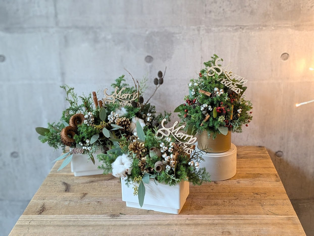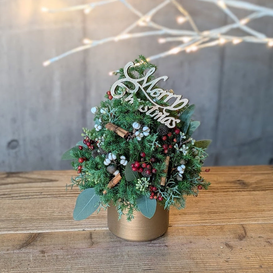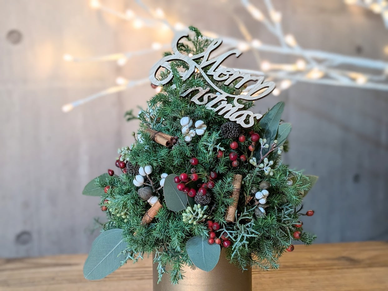 針葉樹の爽やかな香りが広がる、ナチュラルなクリスマスツリー型アレンジメント。