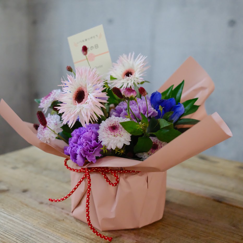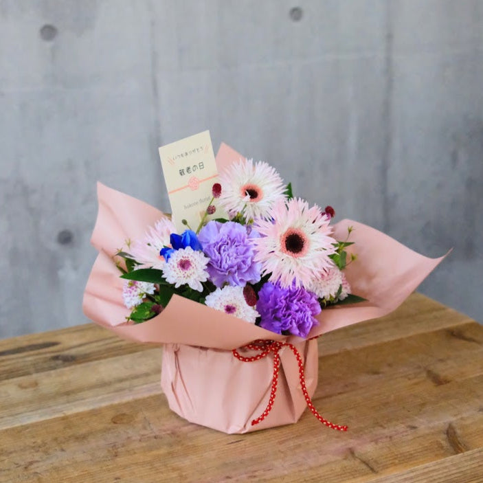 やさしい色合いの花々を丁寧に束ねた敬老の日限定アレンジメントです。