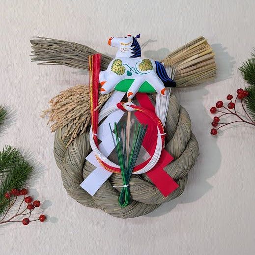 使用素材:特注注連縄・稲穂・紙粘土製干支人形・水引・和紙・平竹